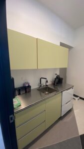 • Remove the existing floor covering and replace with new vinyl (epoxy flooring to be considered should the budget allow it).
