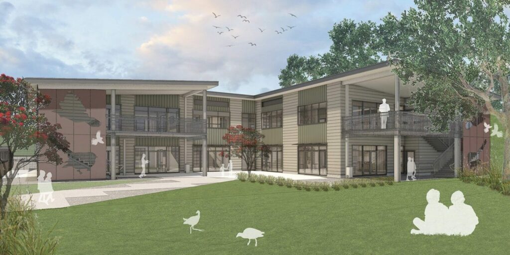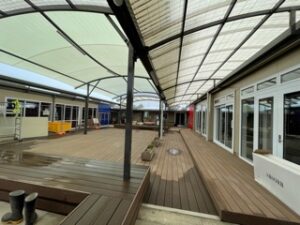 Existing classroom walls extended out under soffit with new framing and new aluminium doors.